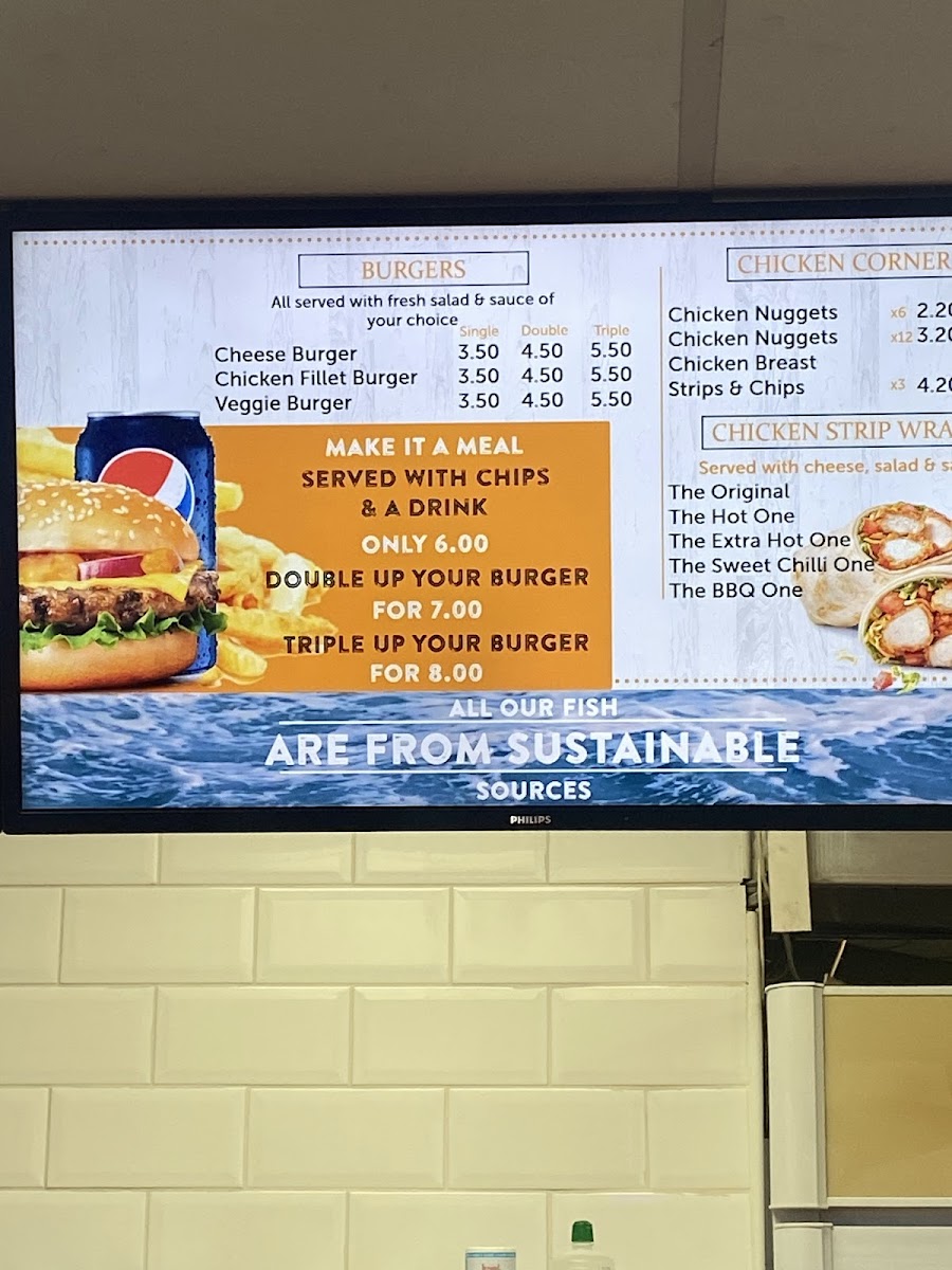 At the heart of their offerings are the fish and chips, undoubtedly the star of the show. Imagine golden, crispy batter encasing succulent, flaky fish—pure bliss with each bite! The chips are perfectly fried to a satisfying crunch, making them the ideal companion to that delicious fish. For those looking to explore further, their burger selection includes a Cheese Burger, Chicken Fillet Burger, and a Veggie Burger, all priced at an unbeatable £3.50, making indulgence not only satisfying but also affordable.